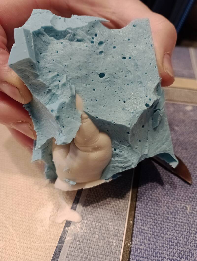 Het handje wat niet in de mond gaat bij duim zuigen en het tegenovergestelde voetje worden gecast, dus linker handje dan rechter voetje. Het is handig als er iemand bij is om de baby af te leiden mocht dat nodig zijn, want hoe stiller de baby zit hoe mooier het resultaat. Het kan ook gedaan worden tijdens het geven van de voeding. Tijdens casten is het handig om oude kleren aan te trekken. Ik werk netjes maar er kan altijd iets geknoeid worden.